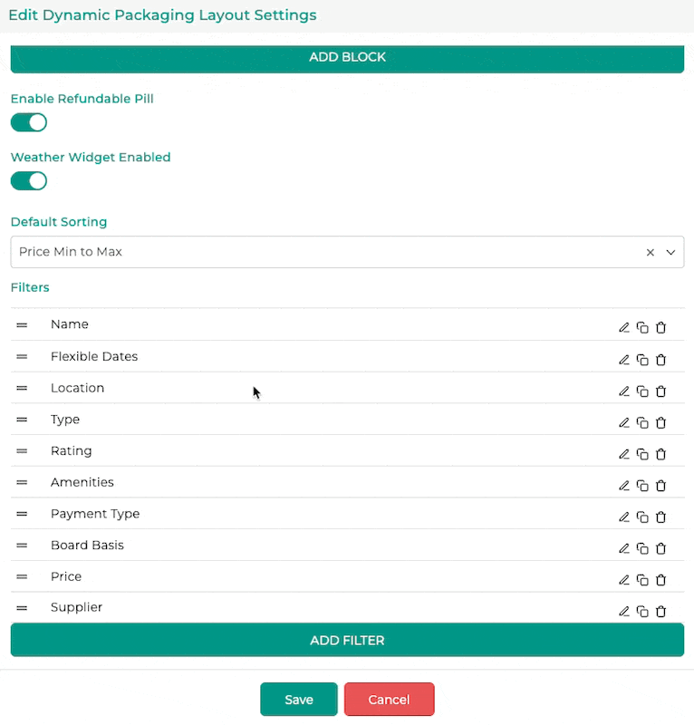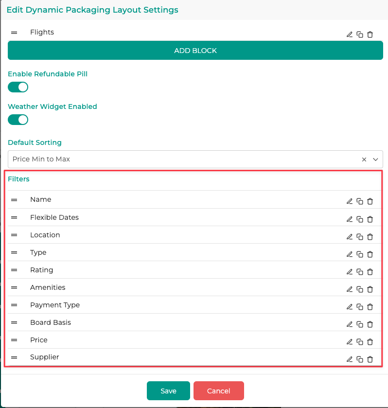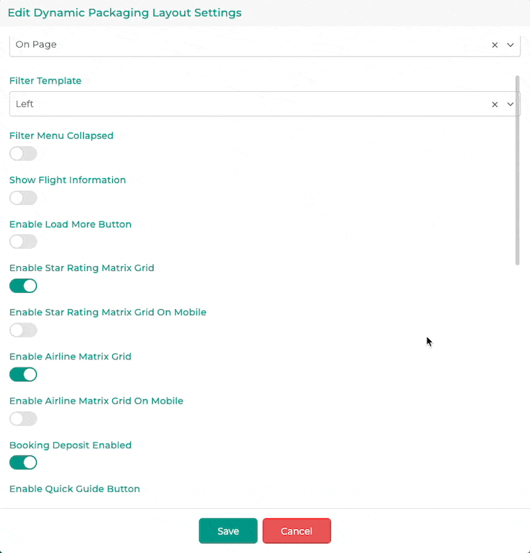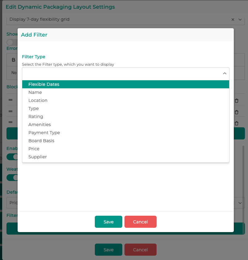 5. Choose the search type you would like to apply the changes to (in this case, I have chosen Dynamic Packaging - (to change the default set up, you will need to follow the steps below for each search type)