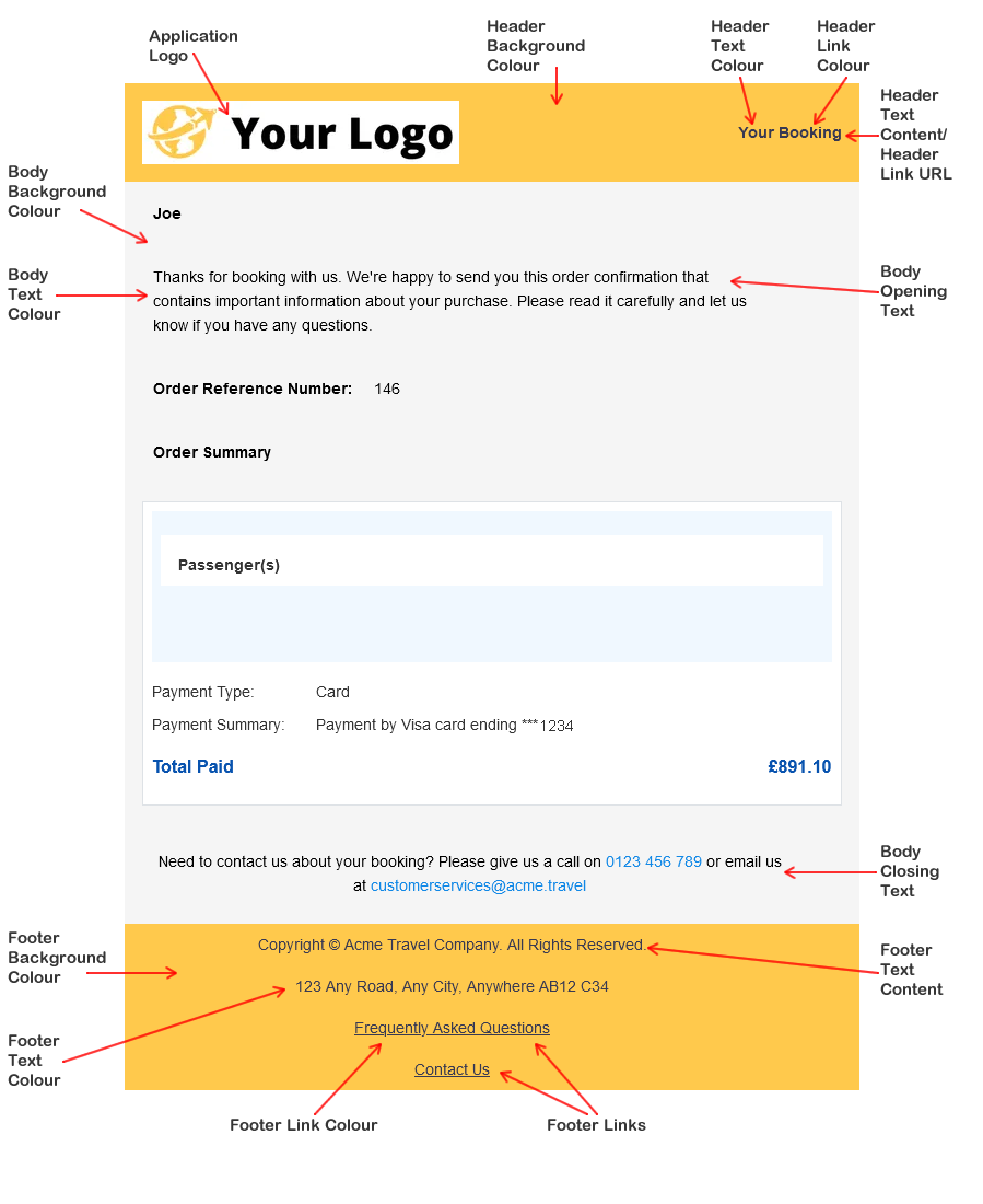 - Email Confirmation Settings - use this section to style and set up your order email confirmations. You can see an example of the email confirmation layout below, along with which settings affect which part of the email.