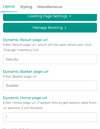 Important widget settings: you must ensure that you have set the Url to your basket/payment page in the widget settings (under Layout). We recommend setting the relative Url to the page rather than the full domain (eg. /basket) as below example. You can also set the Url to your results page and homepage in the other fields.