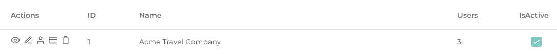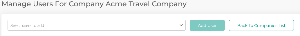 Click on the user/person icon next to the company. Remember, the user will need to exist in your CRM before you can add them to a company. Just use the select/autocomplete field to find the user and then click the "Add User" button to add them into the company. Once you have finished adding users, you can click the "Back to companies list" button to return to the previous screen.