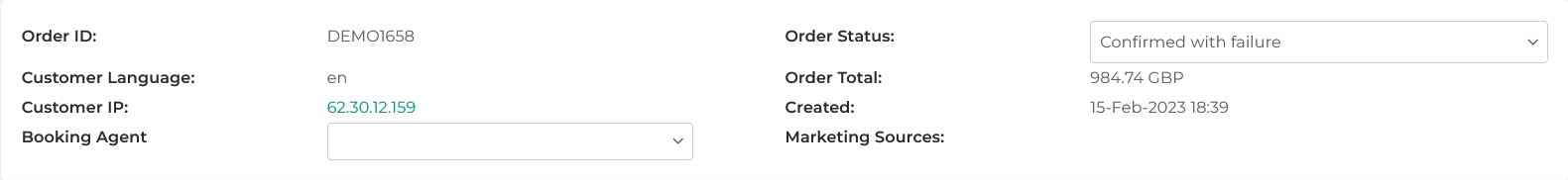 | Cancelled | The whole order has been cancelled. IMPORTANT: This just changes the status on our side, it does not cancel the booking with your suppliers. |