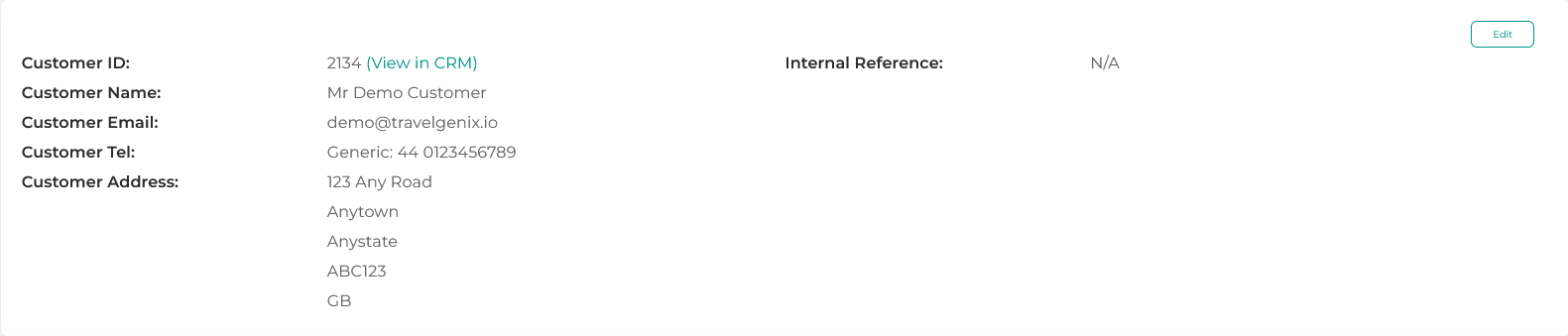 To update any of the customer information on an order, click the "Edit" button on the right of the customer panel. Please note that this will not update the CRM record for this customer, only the contact details for this order.