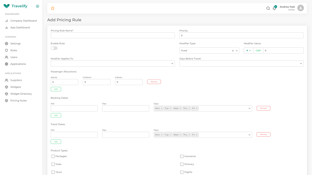 - Travel Dates - Configure when this rule will apply, based on when the customer will travel. Often known as the "Travel window". Configure it to apply to specific days of the week too.