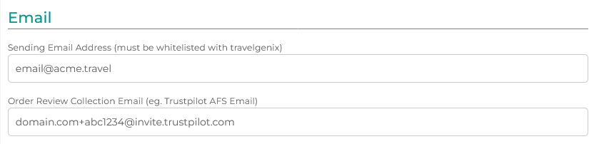 - Head to the AFS service setup page in your Trustpilot Business account and copy the unique email address - you will need to enter this into your Travelify Application Settings > "Email Settings" > "Order Review Collection Email" (see below screenshot as an example)